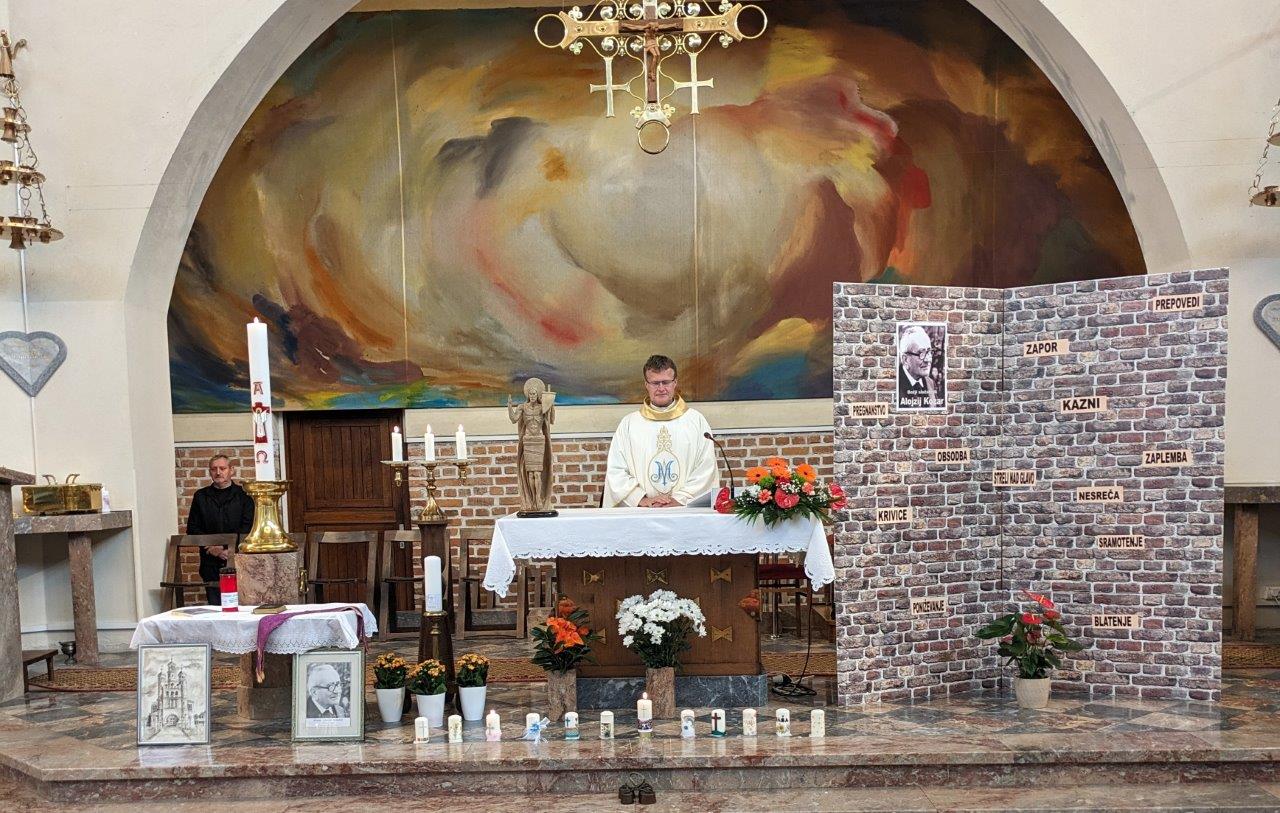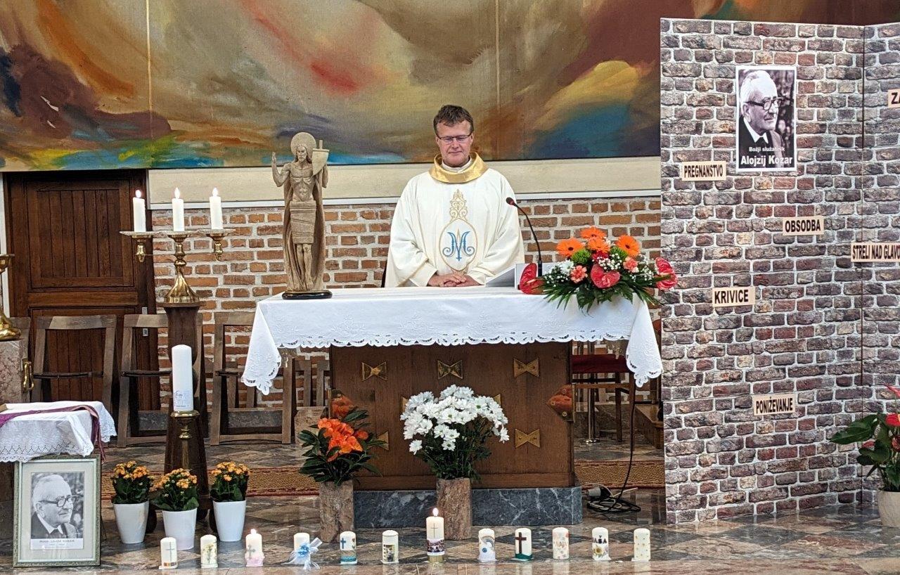 Jutranjo sveto mašo ob obletnici smrti Božjega služabnika Alojzija Kozarja je daroval dr. Franc Zorec, sodelavec škofijskega postopka oz. sodnik cerkvenega sodišča, ki zaslišuje priče, ki karkoli vedo o Božjem služabniku. S petjem so sodelovali pevci zbora Neuničljivo upanje, z branjem prošenj in prinašanjem darov pa so sodelovali učenci, predstavniki posameznih razredov. Ob oltarju je bila postavljena uprizoritev glavne misli, ki jo je potem v pridigi podrobneje predstavil pridigar. Kozar je večkrat stal pred zidom: ko je ob koncu druge svetovne vojne pijan ruski vojak Kozarja postavil pred zid in za šalo streljal tik nad njegovo glavo, ko je bil zaradi gradnje cerkve v zaporu, ko je oblast zaplenila ves gradbeni material za cerkev, ko so »kazni padale kot toča«, ko je doživljal sramotenje, ko se je zgodila nesreča in je umrlo osem ljudi. Toda noben zid ga ni zaustavil, zavzeto je služil Bogu in ljudem. Tudi nam govori, da noben zid ni nepremagljiv, nobena vrata dokončno zaprta.