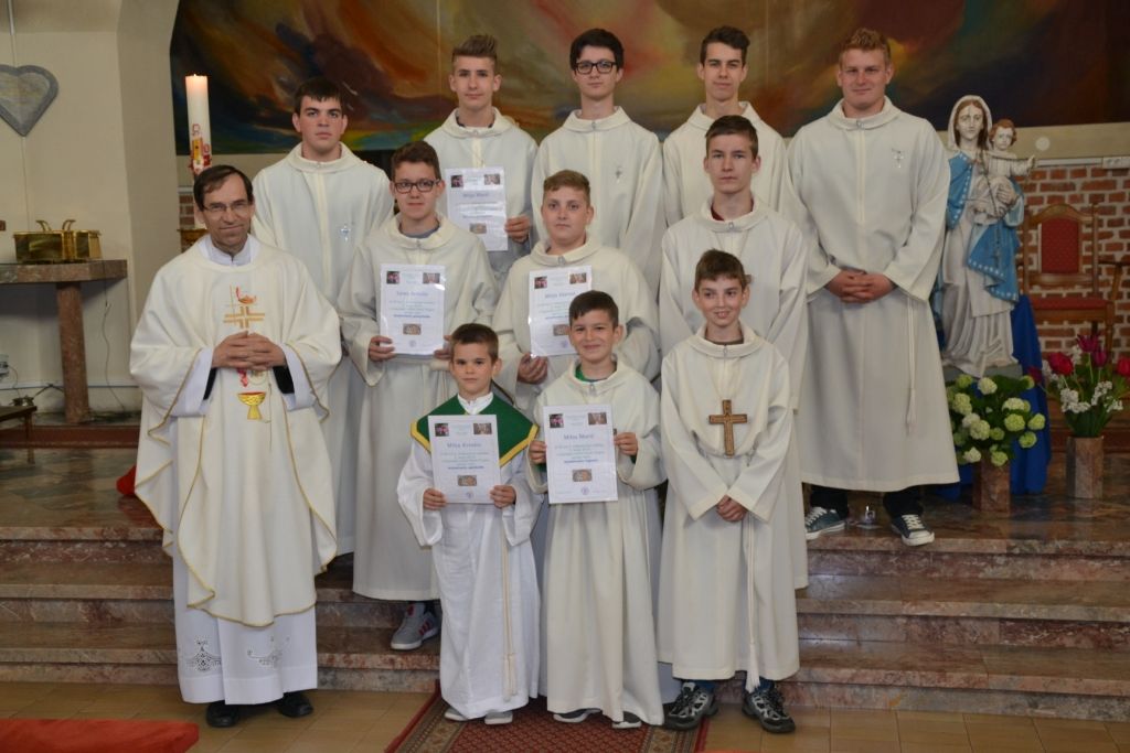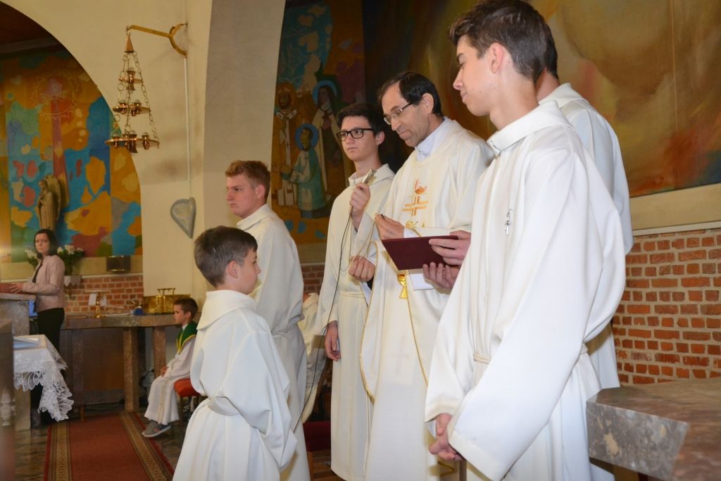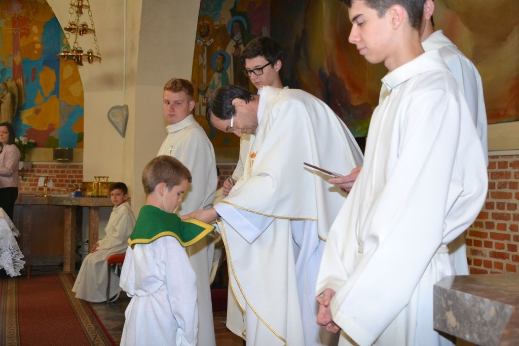 Pri Gospodovem oltarju služijo tudi ministranti, razdeljeni na štiri stopnje: ministranti ogledniki, vajenci, pomočniki in mojstri. Nekateri ministranti so danes sprejeli nove službe. Med ministrante oglednike je bil sprejet Miha Kreslin, med ministrante vajence Miha Marič, ministrant pomočnik je postal Leon Antolin, ministranta mojstra pa Mitja Horvat in Mitja Marič. V znamenje novih služb so prejeli različna liturgična znamenja: obleko, mali ali veliki križ ter majhen kovinski križ. Katehistinja Klavdija Dominko je vsakega ministranta poklicala po imenu, župnik pa mu je izročil ustrezno znamenje. Zbrani verniki so se pridružili molitvi za ministrante, da bi svojo službo zvesto in spoštljivo opravljali.