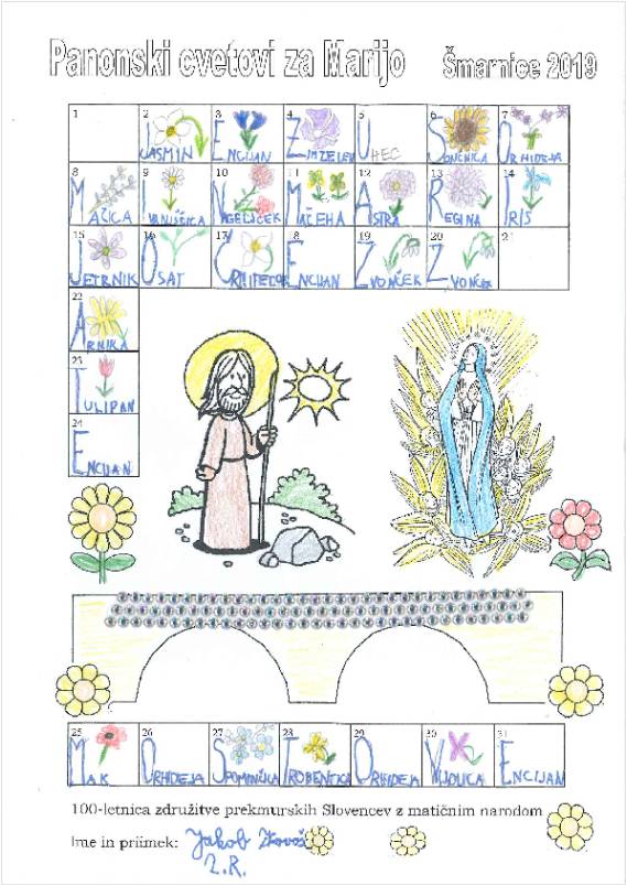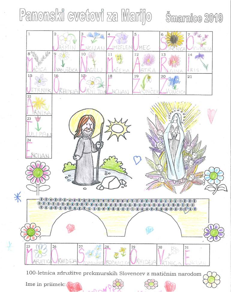 Tudi letos so šmarnice potekale zjutraj s sveto mašo in zvečer, predvsem za otroke, ko smo poslušali zgodbo in peli litanije Matere Božje. Prebirali smo Panonske cvetove za Marijo, šmarnice ob 100-letnici združitve prekmurskih Slovencev z matičnim narodom. Šolarji so vsak dan zapisali eno črko in sestavili misel: Z Jezusom in Marijo čez zlate mostove. Zapisali so še ime rože in cvet narisali. Najboljši so za nagrado prejeli kupon za brezplačno udeležbo na 10. Kozarjevem pohodu in pobarvanko Prelepo ravno je polje.